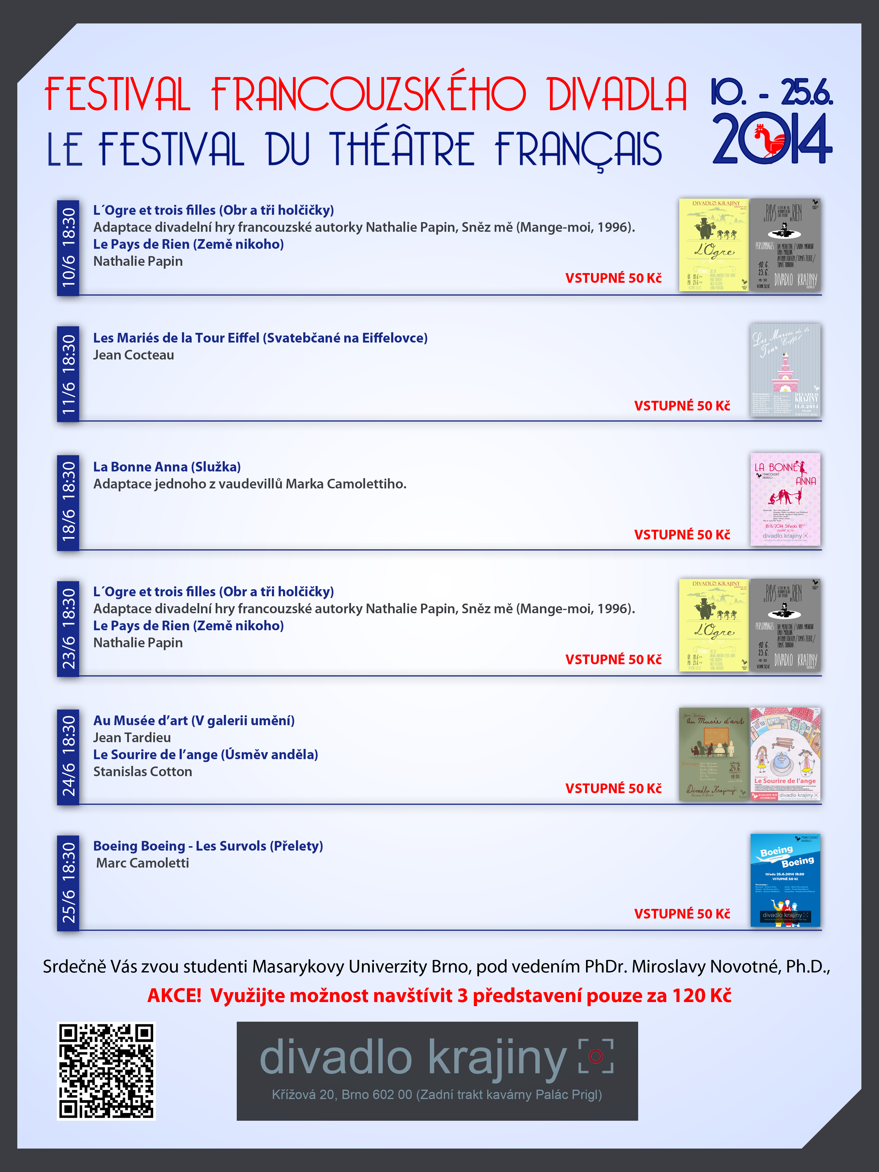Kolektiv amaterských herců francouzského divadla Masarykovy univerzity vás srdečně zve na FESTIVAL FRANCOUZSKÉHO DIVADLA, který probíhá ve dnech 10. - 25. 6. v Divadle Krajiny na Křížové ulici v Brně.